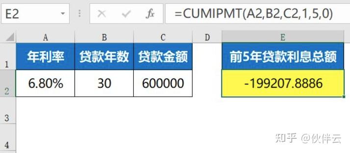 举例 :小明向银行贷款60万,30年还清,贷款年利率6.8%,要求计算前5年贷款利息总额是多少?