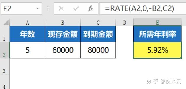 在E2单元格,输入函数公式:=RATE(A2,0,-B2,C2)