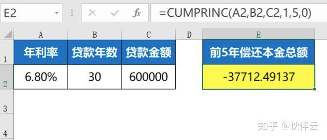 举例 :小明向银行贷款60万,30年还清,贷款年利率6.8%,要求计算前5年偿还本金总额是多少?