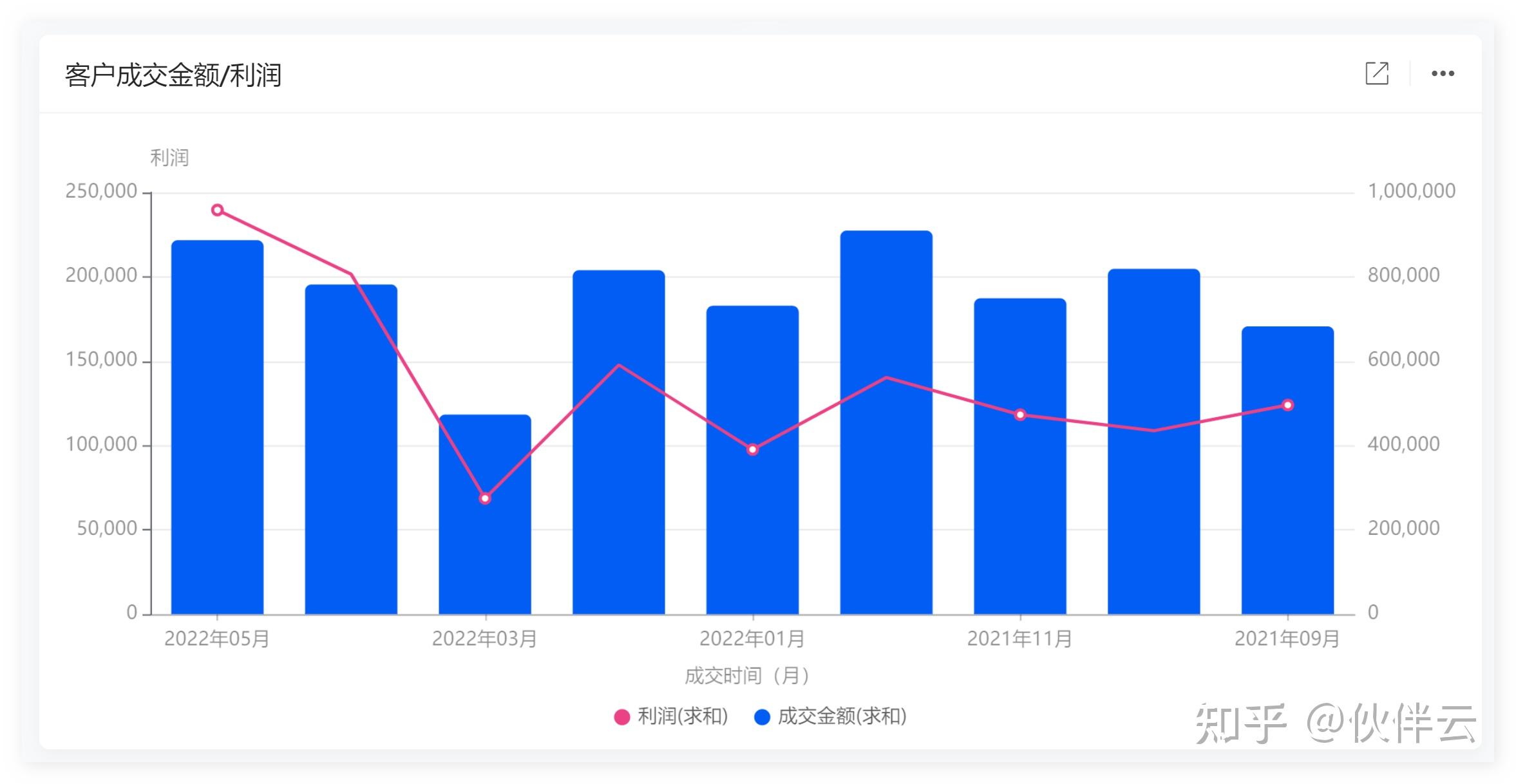 我们还可以用双轴图来展示自己半年内为公司带来的利润和客户成交额的数值、变化趋势、以及它们二者变化趋势的差异。