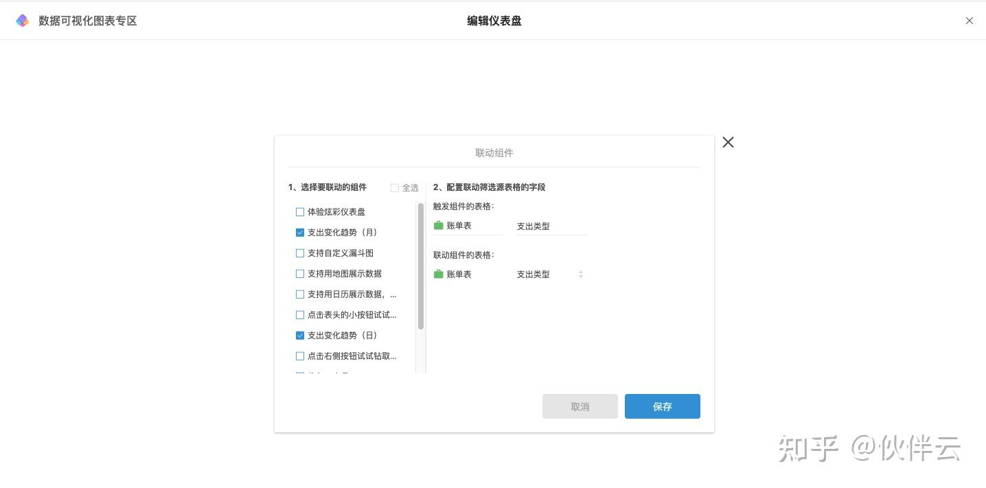 b.配置联动筛选源表格的字段。触发组件的表格:账单表 支出类型;联动组件的表格:账单表 支出类型;