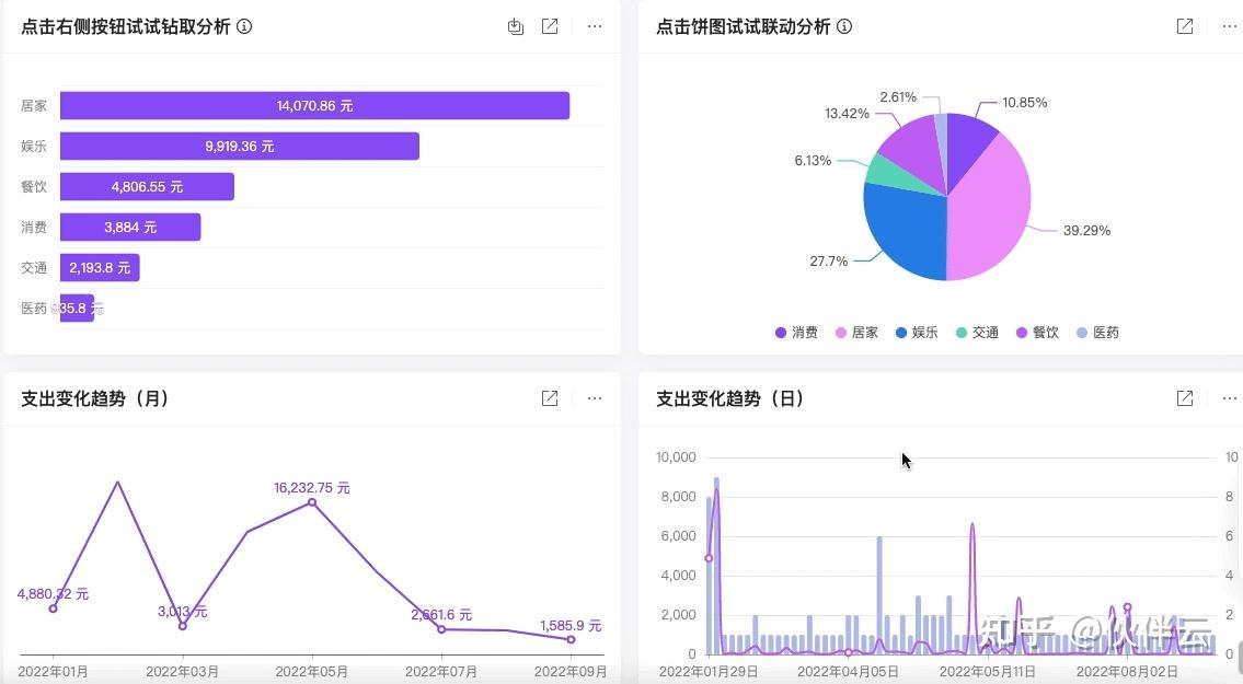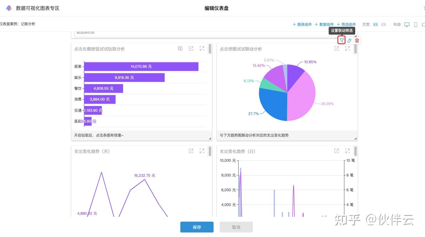 a.选择要联动的组件:支出变化趋势(月)和双轴图:支出变化趋势(日),