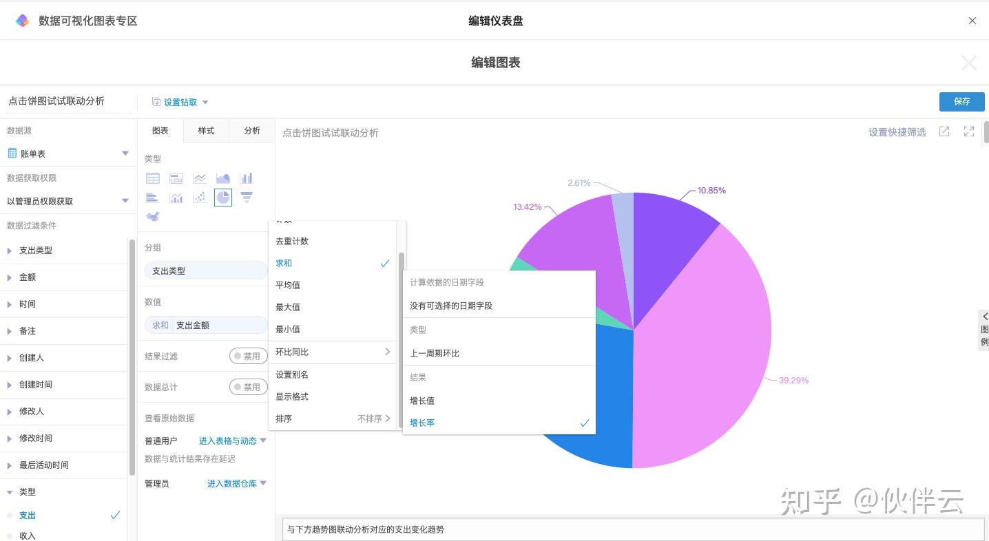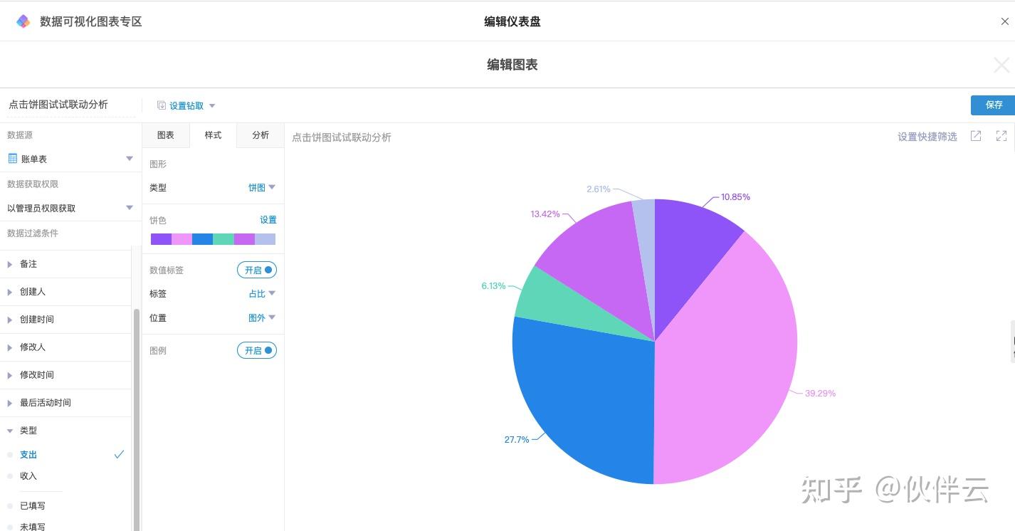 选择图表组件-饼图,数据源选择刚创建的账单表。