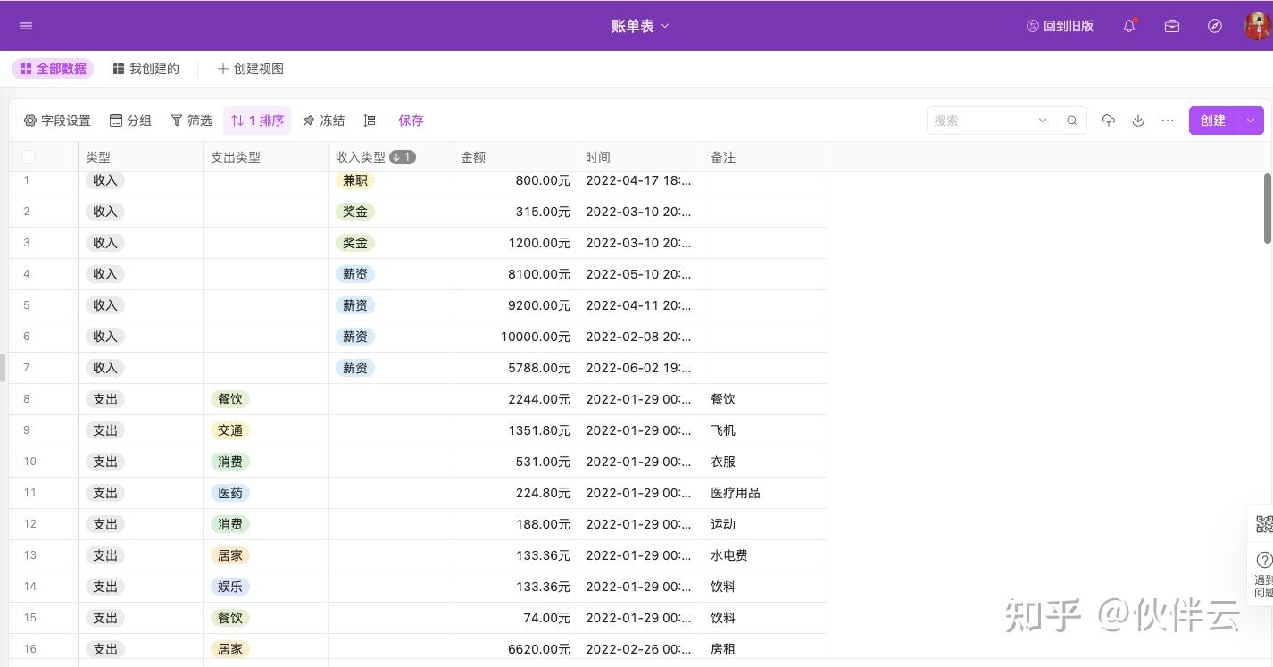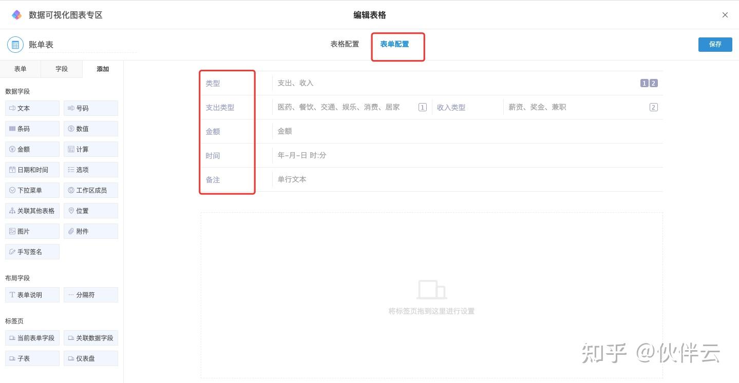 编辑该表格,表单配置中分别添加包含类型(下拉菜单字段)、支出类型(选项字段)、收入类型(选项字段)、金额(金额字段)、时间(日期和时间字段)、备注(文本字段)等字段。