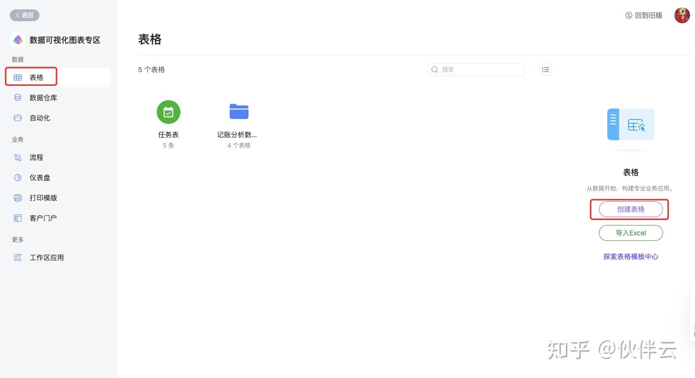 1、进入伙伴云管理者后台,点击表格-创建表格,创建一张表格:账单表。