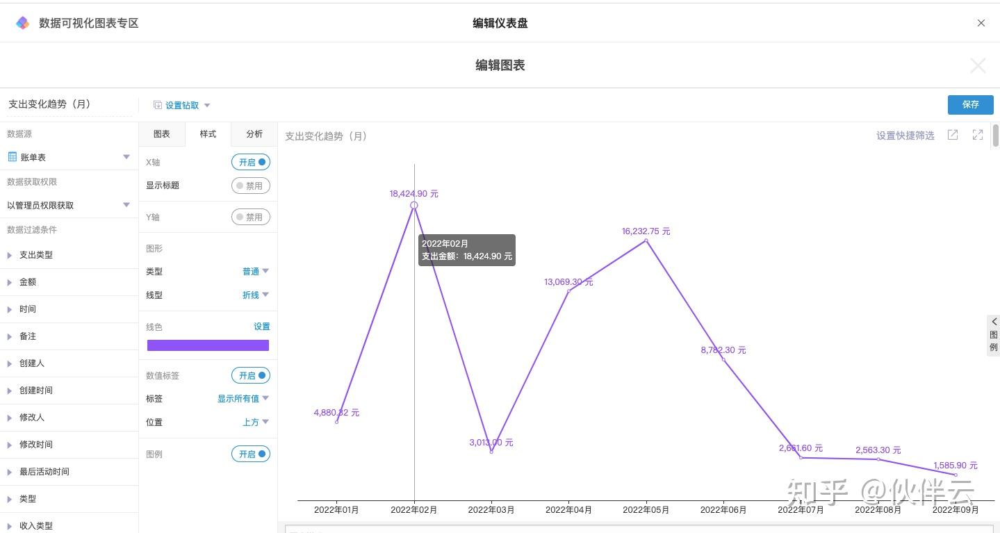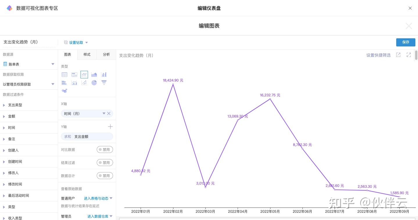 选择图表组件-折线图,数据源选择刚创建的账单表,饼图名称:支出变化趋势(月)
