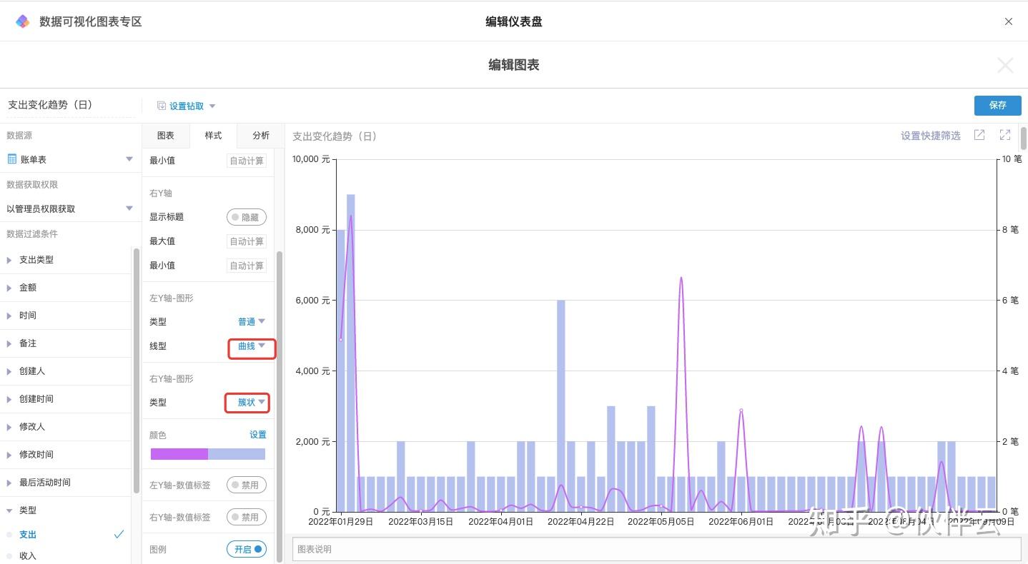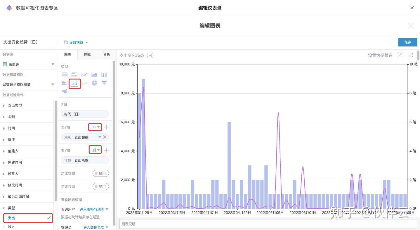 选择图表组件里的”双轴图“,数据源依旧选择为账单表,筛选出类型为“支出”的数据。