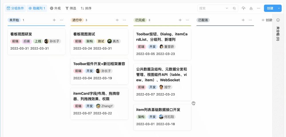 通过多个“分组”来代表工作的不同阶段。事项可以在不同“分组”间自由拖动,所处阶段一目了然。