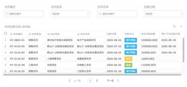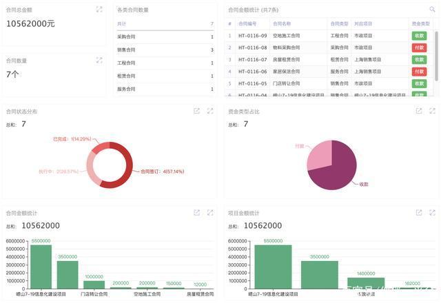 轻松管理应付/应收合同款,保证资金流入、流出清晰可追踪,每一分钱都逃不过你的眼睛;以合同为维度统计营收/支出,哪个合同值得重点投入,哪个合同比较“鸡肋”,一眼就能看出;无论是单独使用,还是与客户管理、财务报表、项目进度管理等关联,它能都能满足,流程从未如此清晰。1.收付款与合同相关联,实时同步合同信息