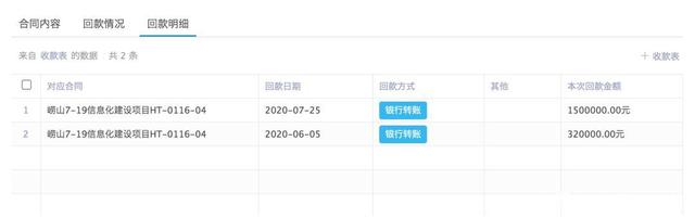 如果你想要查看回款明细,可点击页面下方对应标签页,查看明细数据。当收款表中所有对应合同收款额总和等于合同总金额,即当待回款金额为0时,系统可自动将回款状态调整为已收款。
