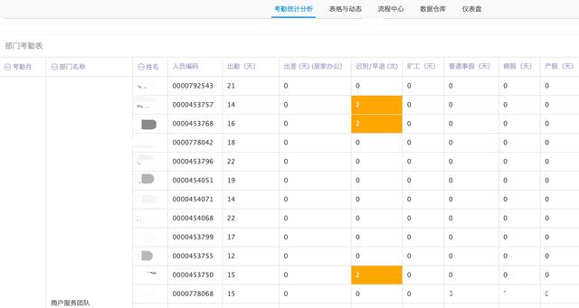 产品demo演示环境下截图此外,像请假天数、迟到时长累计数、矿工数、请假数……甚至部门每日人均工作时长、平均加班时长、到岗率、考勤异常申诉数等都能在后台直观的进行展示。