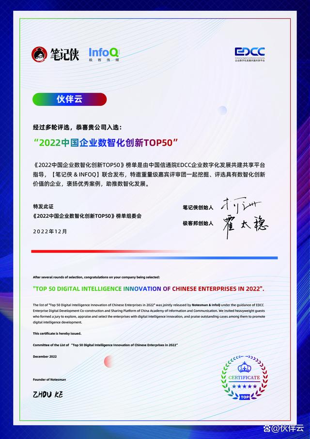此次入选《2022中国企业数智化创新TOP50》榜单,是对伙伴云在数智化方面取得成绩的肯定。