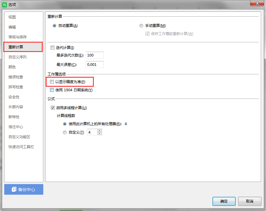 如果是计算出现误差数值比较少,可以单击左上角”wps图标“/’文件”---“选项”,弹出对话框,单击”重新计算“,在这勾选”以显示精度为准“再核实情况哦~