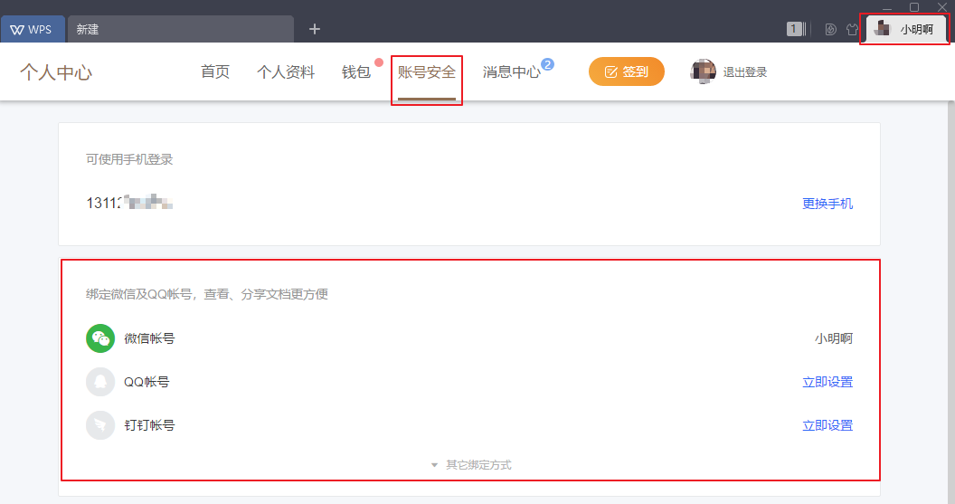 1.点击软件右上角「个人头像-账号安全」中绑定/解绑其他登录渠道即可;
