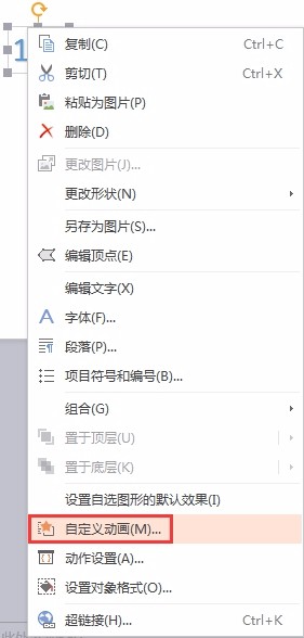 选中需要添加动画的对象,点击鼠标右键“自定义动画”,在右侧窗格内弹出自定义动画的设置界面。