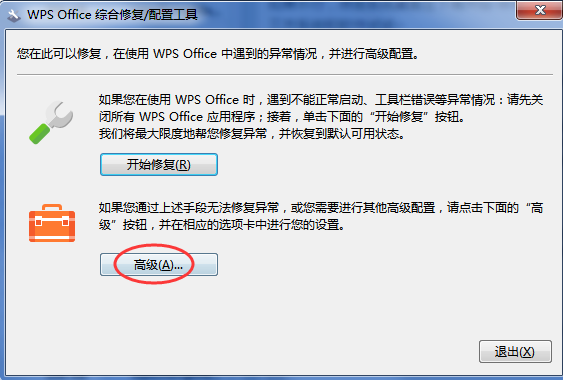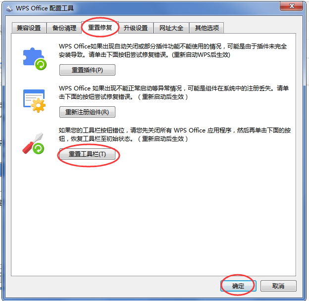 点击系统桌面左下角开始-所有程序-WPSoffice-WPSoffice工具-配置工具-高级-重装修复-重置工具栏-确定,然后重启WPS