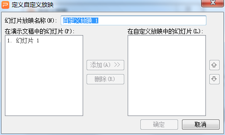 在“定义自定义放映”对话框中,键入幻灯片放映的名称。选取“在演示文稿中的幻灯片”,单击“添加”,将需要播放的幻灯片加入到“在自定义放映中的幻灯片”列表中。单击“确定”。
