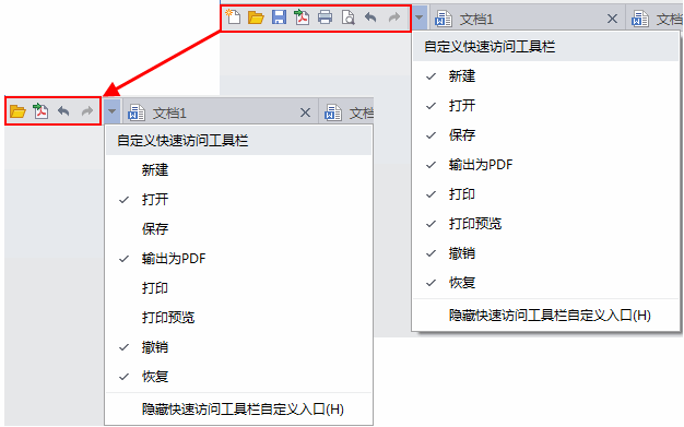 WPS文档标签栏左侧的快速访问工具栏,可以快速执行新建、保存、转换PDF等操作。 自定义快速访问工具栏快速访问工具栏下拉菜单,通过勾选功能项,选择显示或者隐藏功能项。