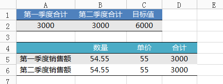 例如,我们要预算公司上半年的销售额,由两个季度合计完成,每个季度由卖出的数量乘以单价得出季度销售额。
