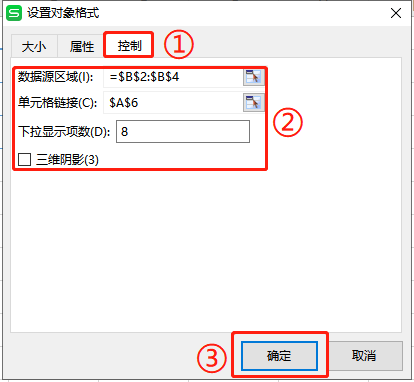 在“设置对象格式”弹出框中选择“控制”,根据需要设置“数据源区域”(这里选择B2:B4区域),以及“单元格链接”(选择一个空白单元格,这里选择A6,这里尽量选择A列的单元格),“下拉显示项数”是自动生成,根据需要选择是否勾选“三维阴影”,然后点击“确定”;