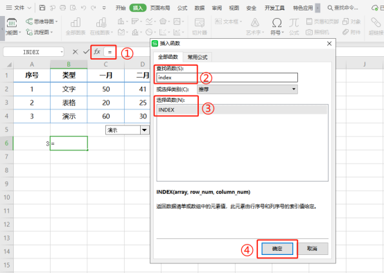 选中B6单元格,点击“插入函数”,选择并插入INDEX函数;