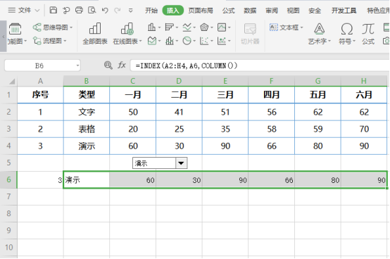 (注:这里公式为“=INDEX(A2:H4,A6,COLUMN())”)