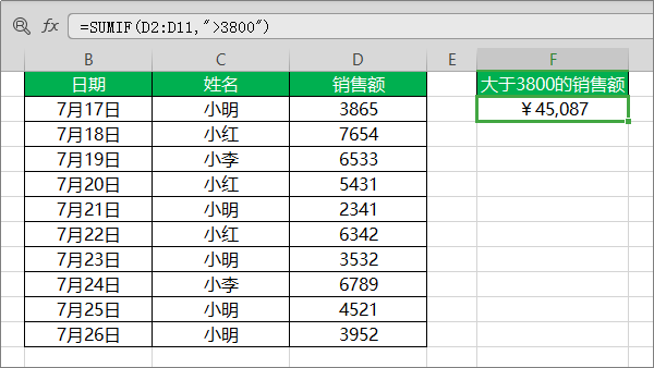 在F2单元格输入=SUMIF(D2:D11,">3800");表明大于3800的销售额