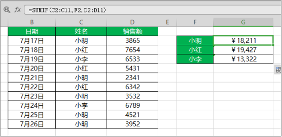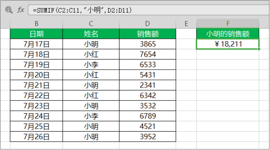 在F2单元格输入=SUMIF(C2:C11,"小明",D2:D11);表明小明的销售额