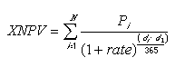 年 1 月 1 日的序列号是 39448,这是因为它距 1900 年 1 月 1 日有 39448 天。Dates 中的数值将被截尾取整。如果任一参数是非数值的,函数 XNPV 返回 错误值 #VALUE!。如果 dates 中的任一数值不是有限日期,函数 XNPV 返回 错误值 #VALUE!。如果 dates 中的任一数值先于开始日期,函数 XNPV 返回 错误值 #NUM!。如果 values 和 dates 所含数值的数目不同,函数 XNPV 返回 错误值 #NUM!。函数 XNPV 的计算公式如下: