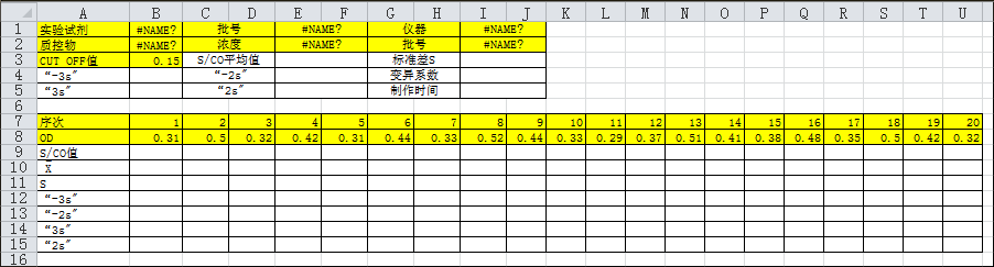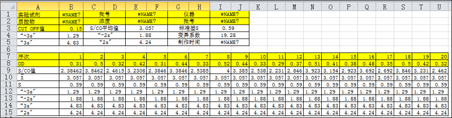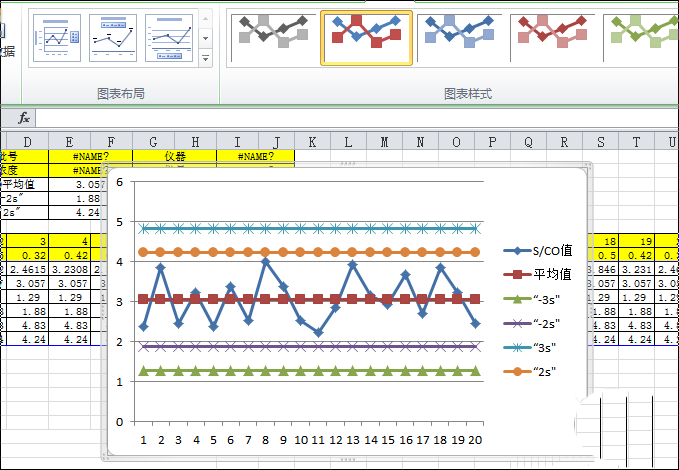 标准差S=STDEV(B9:U9)”-3S“=E3-3*I3”-2S“=E3-2*I3”3S“=E3+3*I3”2S“=E3+2*I3