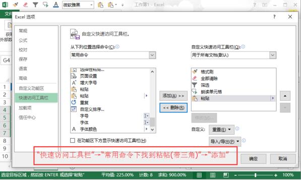 2、“快速访问工具栏”→“常用命令下找到粘帖(带三角)”→“添加”