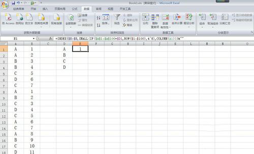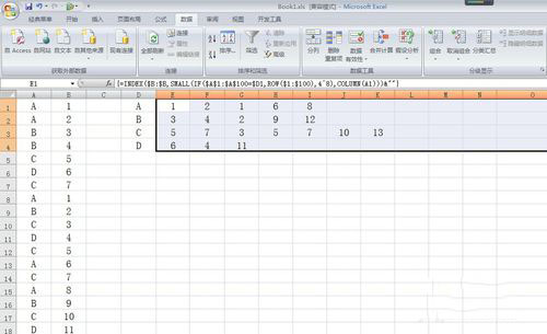 5、接下来就是提取对应的B列数值,在E1中输入公式=INDEX($B:$B,SMALL(IF($A$1:$A$100=$D1,ROW($1:$100),4^8),COLUMN(A1)))&"",按ctrl+shift+回车键。