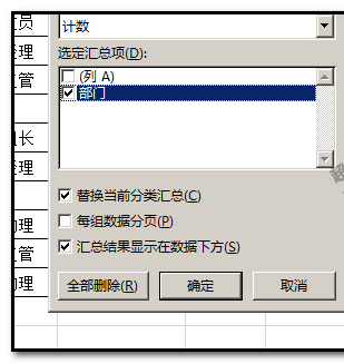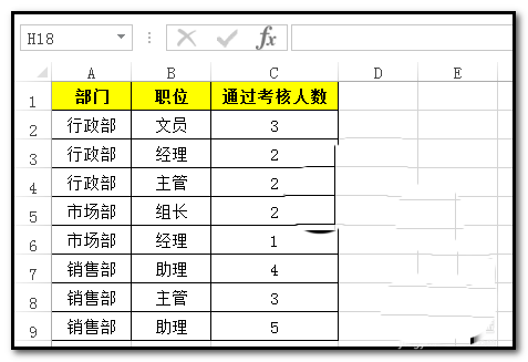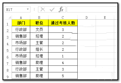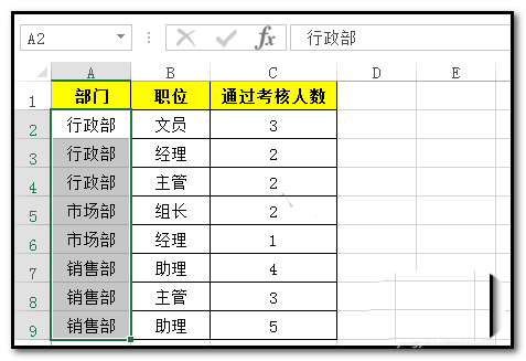 1、如图中的表格数据;A列中,显示着各个部门名称,现在需要把相同部门的单元格给合并在一起;但,相同部门的单元格并不是排列在一起。