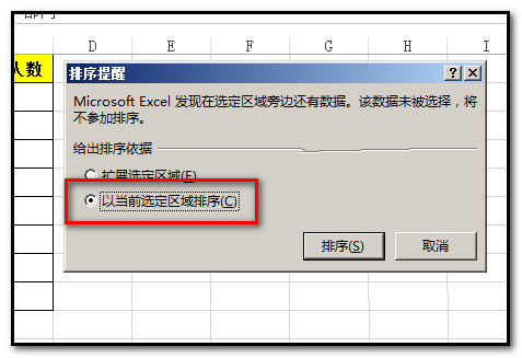 4、假设点升序;弹出的对话框中,默认是扩展选定区域;我们要点选第二个:以当前选定区域排序,点:排序