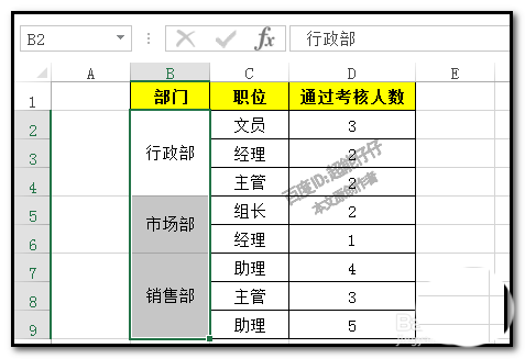 9、这时,只剩下上面合并的空单元格;那么,我们就把这些合并的空单元格用格式刷刷到部门这里来。使到部门这一列得到相同的格式,再把A列删除。