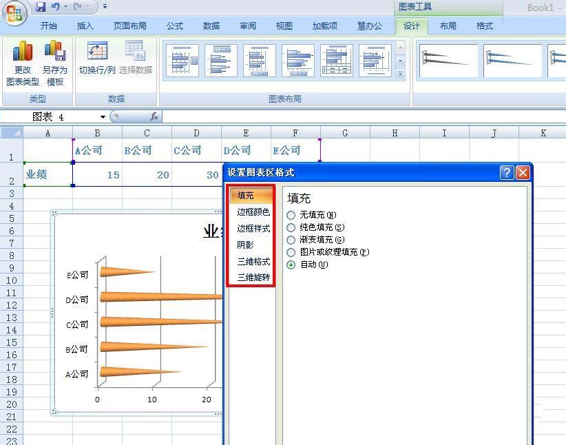在弹出的“设置图表区域格式”对话框中可以进行“填充”“边框颜色”“边框样式”“阴影”“三维格式”“三维旋转”的设置。
