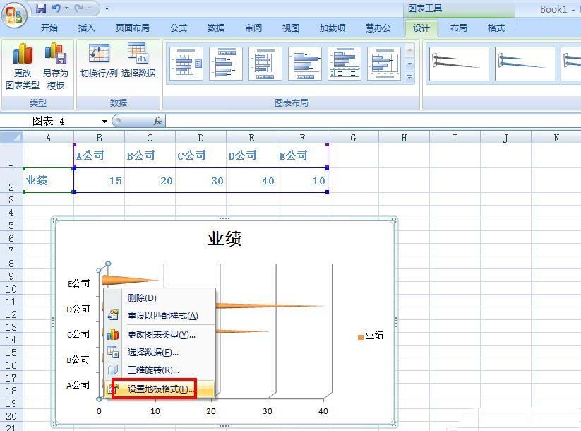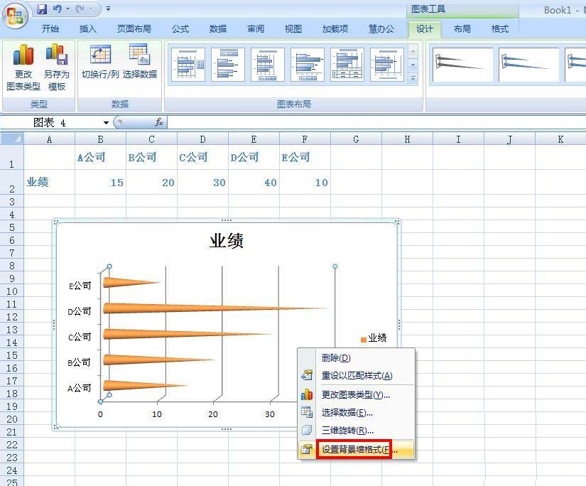 在条形统计图的背景墙区域单击右键选择“设置背景墙格式”即可完成对背景墙的设置。