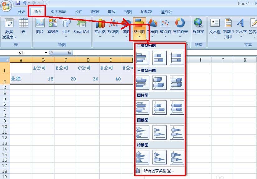 2、选择数据区域表格,单击菜单栏“插入”——条形图,在“二维条形图”“三维条形图”“圆柱图”“圆锥图”“棱锥图”中选择一种条形统计图。