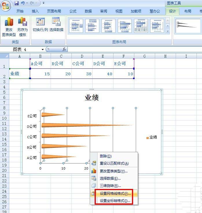 在条形统计图的网格线上单击右键选择“设置网格线格式/设置坐标轴格式”即可完成对网格线/坐标轴的设置。