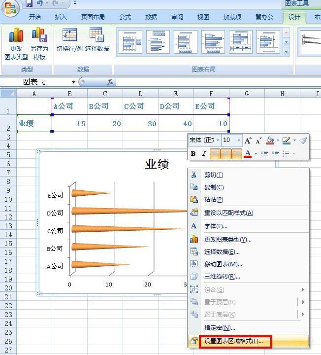在条形统计图的空白区域单击右键选择“设置图表区域格式”。