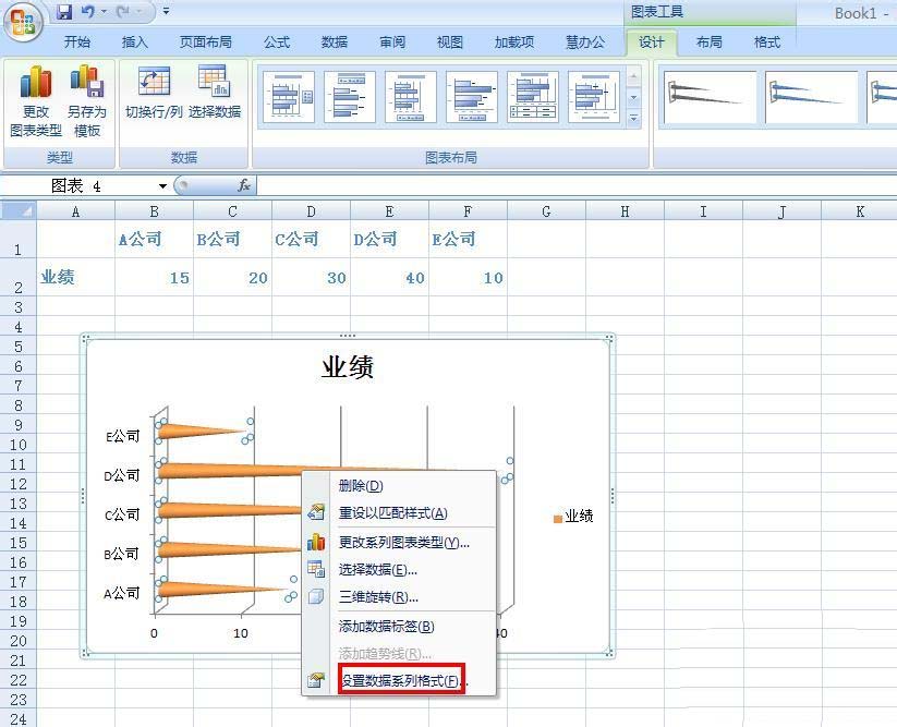 在条形统计图的数据点上单击右键选择“设置数据系列格式”即可完成对设置数据系列格式的设置。