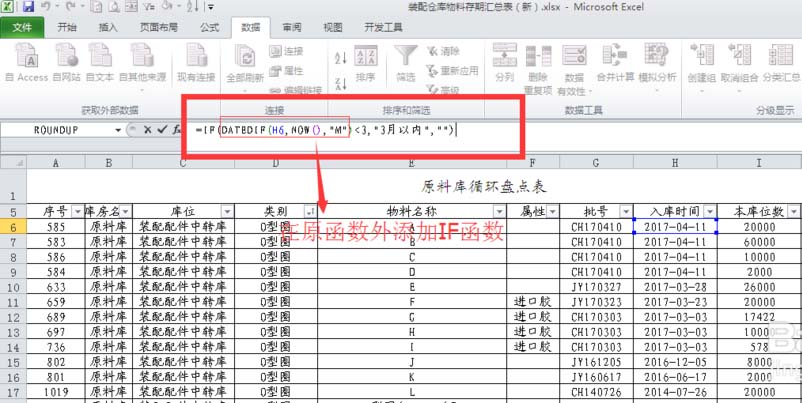 3、键入if函数,“=IF(DATEDIF(H6,NOW(),"M")<3,"3月以内","")”,表示入库时间到现在小于3个月的小时3个月以内,否者显示空格