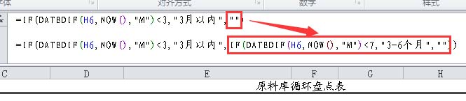 4、再套用if函数,“=IF(DATEDIF(H6,NOW(),"M")<3,"3月以内",IF(DATEDIF(H6,NOW(),"M")<7,"3-6个月",""))”,显示出4-6月