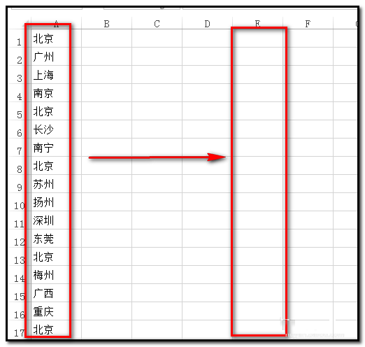 2、现在,把A1到A17单元格这些地区当中把“北京”这个地区复制并粘贴到E列中。