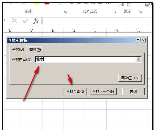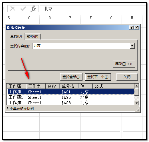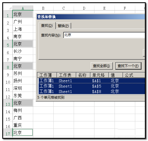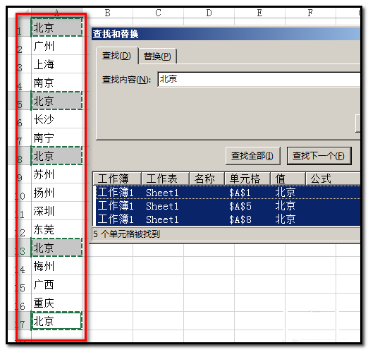7、点“查找全部”后,查找框内即显示A列中所有“北京”的单元格;