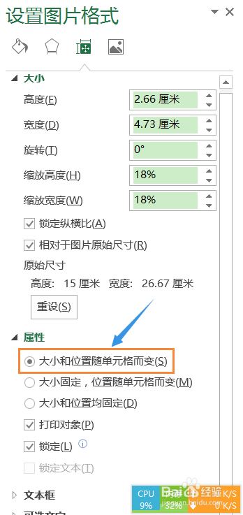3、在属性选项,我们勾选"大小和位置随单元格而变",然后将此窗口关闭,不过这样还是不行的...