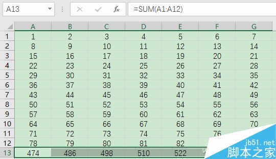 如果想同时求出每一列的数据之和,怎么办呢?很简单,选中所有列数据,然后还是按Alt+=键,将会发现,末尾一行之下,分别显出所有列的和了。