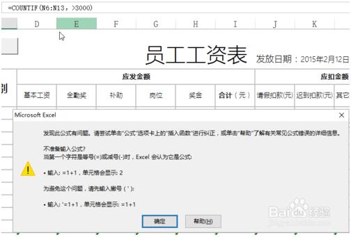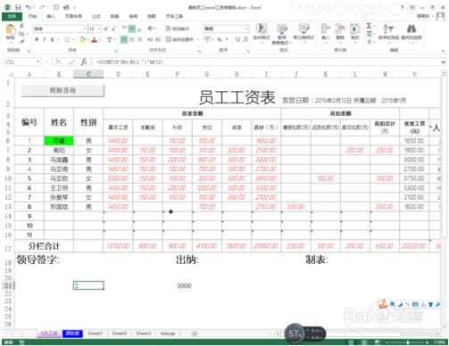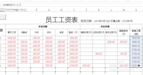 2.需要统计实发工资大于3000的人数,就可以使用countif函数来获取。首先选择判断的区域。如图所示: