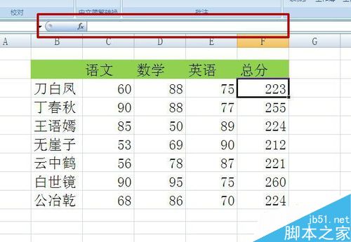 1、打开整理好的数据表格,可以看到总分列进行了求和的函数公式,现在要将公式隐藏且不被修改模式。