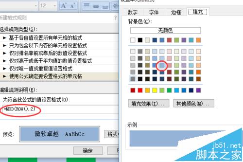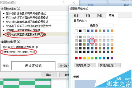 7、我们再次选择刚刚设置的区域,单击条件格式中的新建规则,这次我们输入公式:=MOD(ROW()+COLUMN(),2)=0,并将设置底纹为淡蓝色。